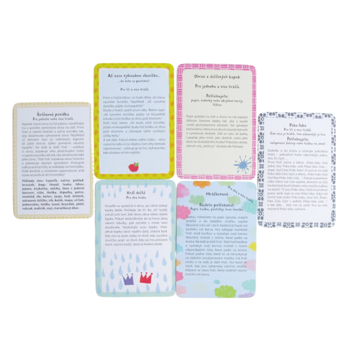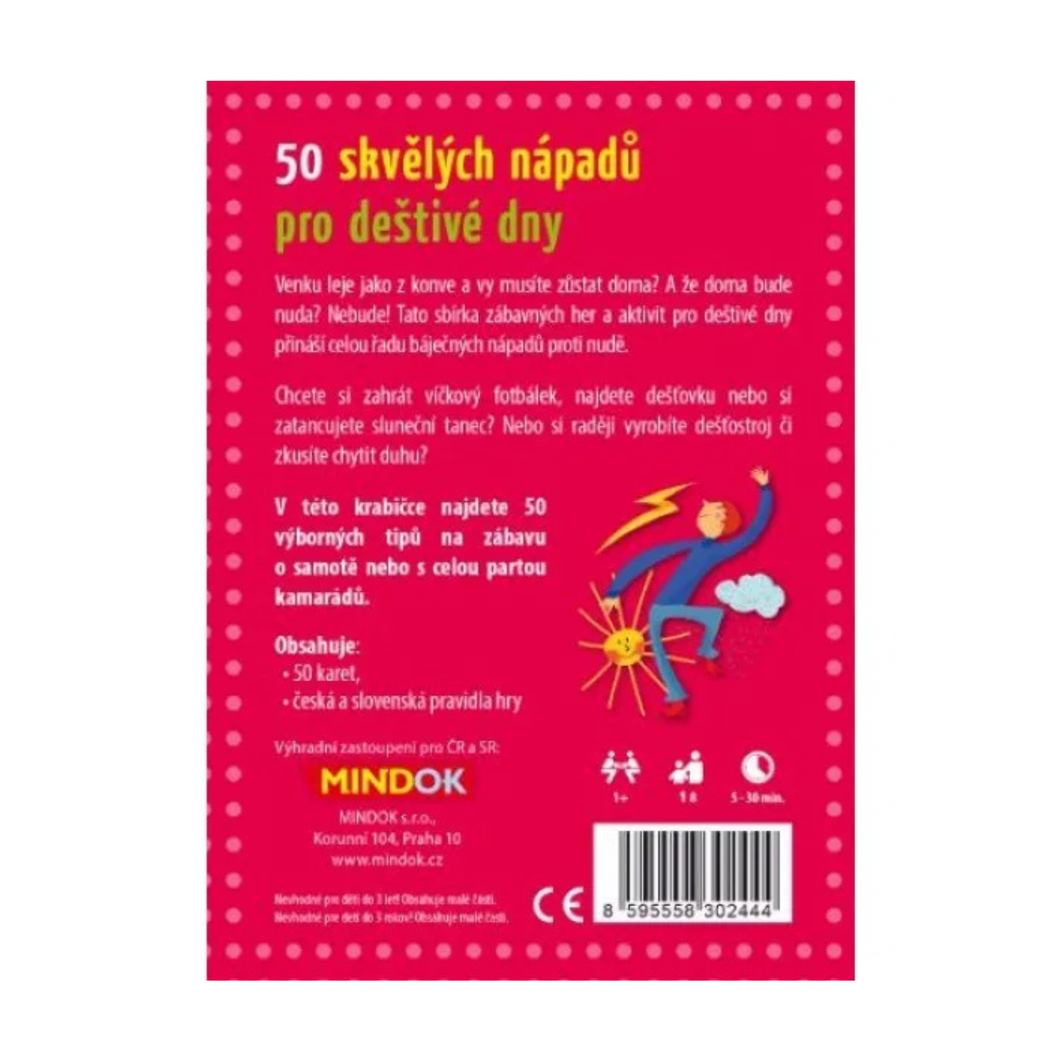 Tato sbírka zábavných her a aktivit pro deštivé dny přináší celou řadu báječných nápadů proti nudě. Chcete si zahrát víčkový fotbálek, najdete dešťovku nebo si zatancujete sluneční tanec? Nebo si raději vyrobíte dešťostroj či zkusíte chytit duhu? V krabičce najdete 50 výborných tipů na zábavu o samotě nebo s celou partou kamarádů.