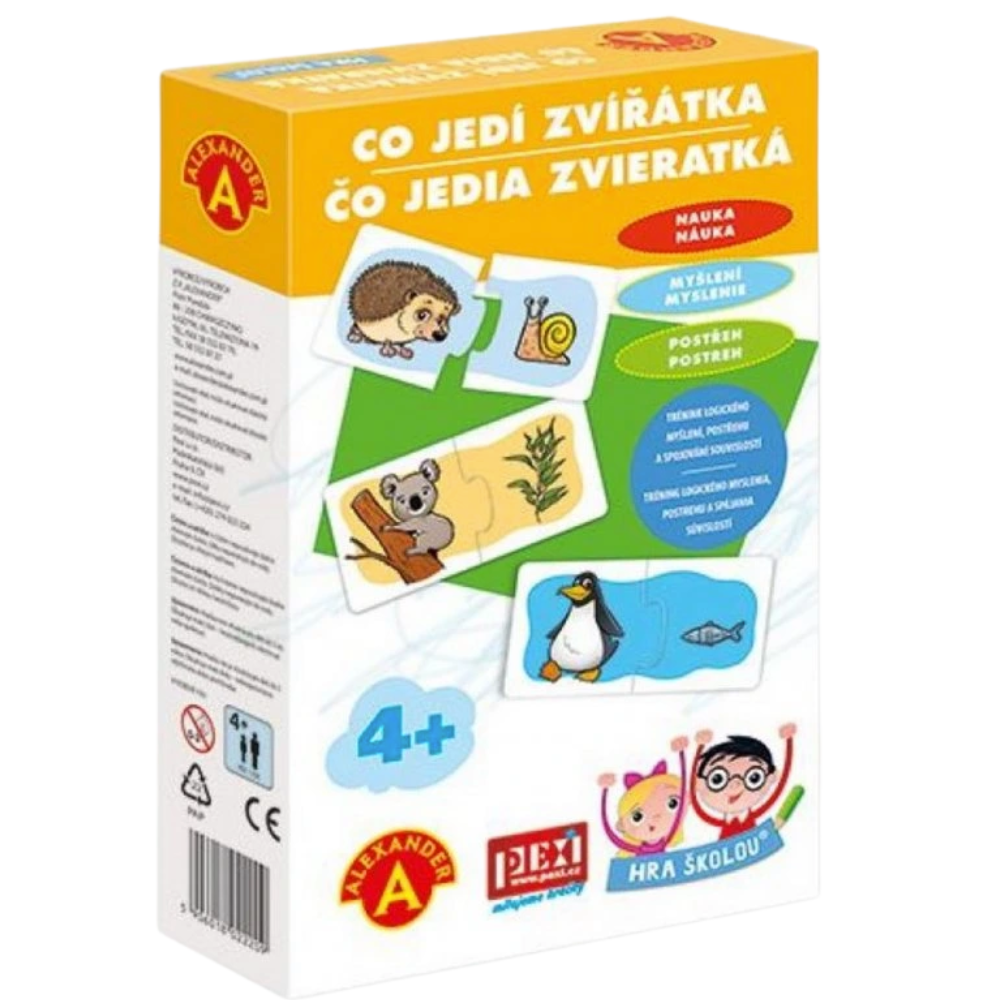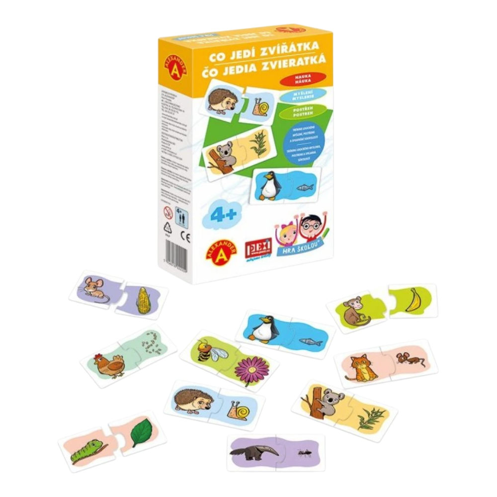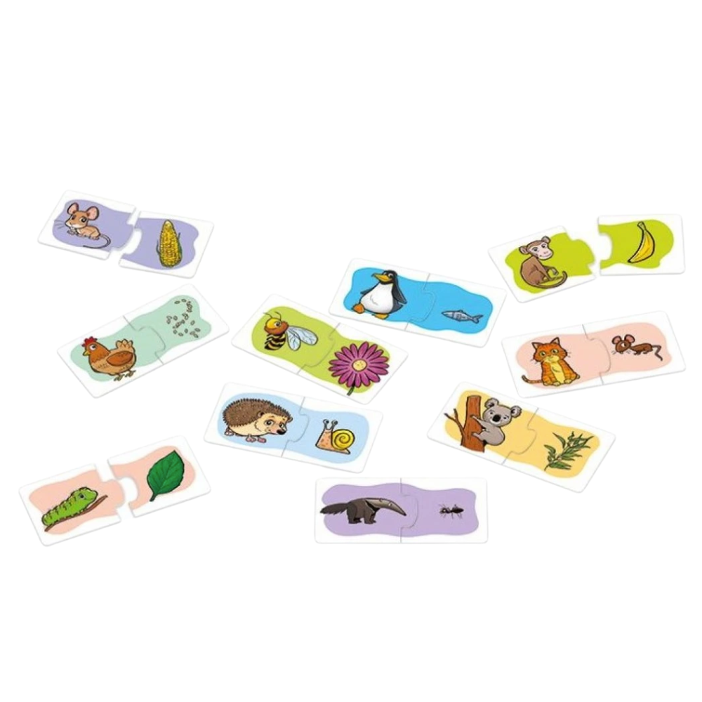 Krabička je plná zvířátek a jejich pochoutek. Pomocí dvoudílných velkých kartiček se děti učí, co jedí zvířátka. Tvar spojení jim napoví, jestli opravdu našli správnou dvojici.