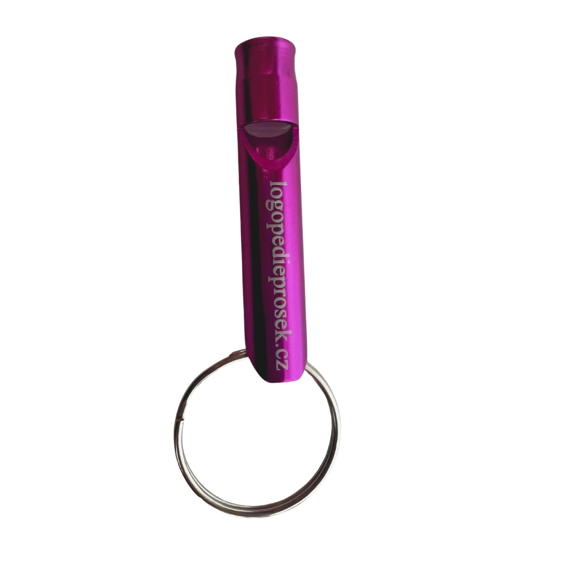 Fialová kovová píšťalka s kroužkem pro přivěšení.