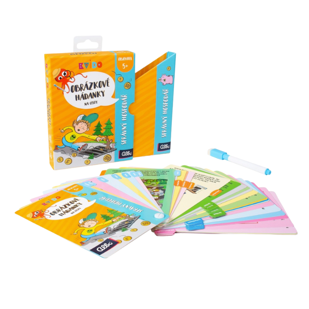 Obrázkové hádanky na cesty - Správný hospodář od Kvída jsou originální ilustrované hádanky od českých autorů, které rozvíjí základní znalosti dětí v oblasti finanční gramotnosti a vlastní zodpovědnosti.