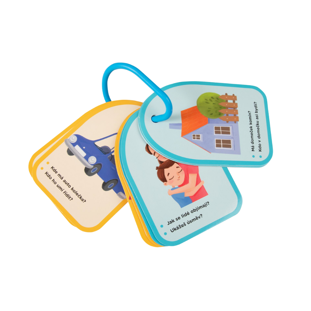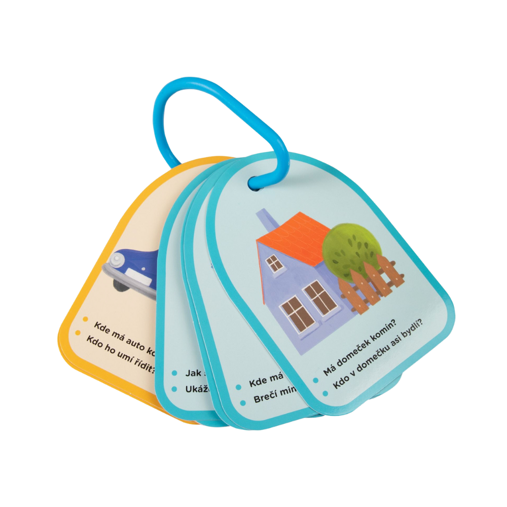 Povídací karty: U nás doma obsahují: 10 oboustranných ilustrovaných karet s 20 obrázky, pružný plastový klip k zavěšení karet na kočárek nebo postýlku.