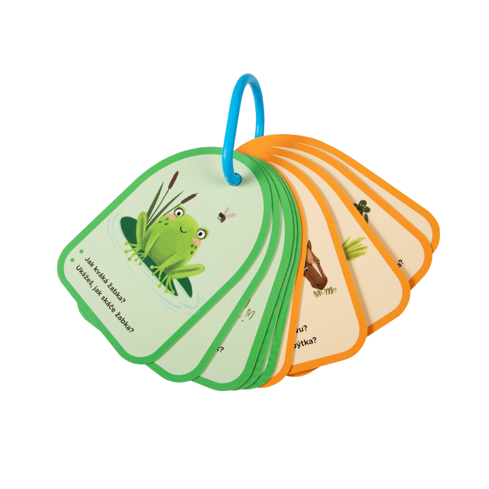 10 oboustranných karet s obrázky a jednoduchými otázkami na podporu povídací interakce rozvíjí slovní zásobu, dialogové povídání a propojení řeči s vizuální oporou.