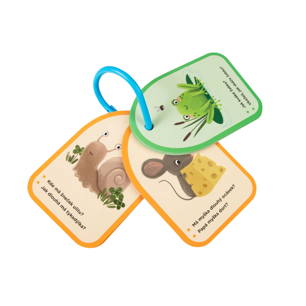 Povídací karty: Zvířátka obsahují: 10 oboustranných ilustrovaných karet s 20 obrázky, pružný plastový klip k zavěšení karet na kočárek nebo postýlku.