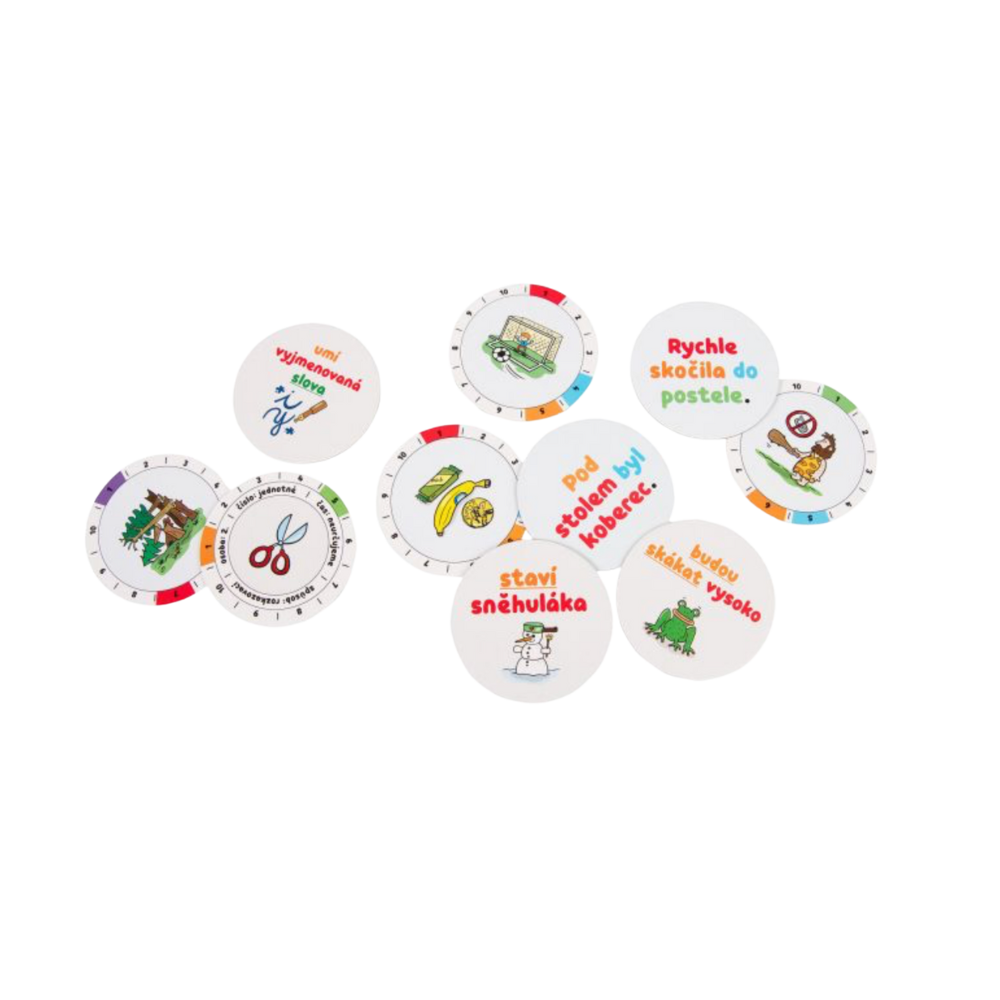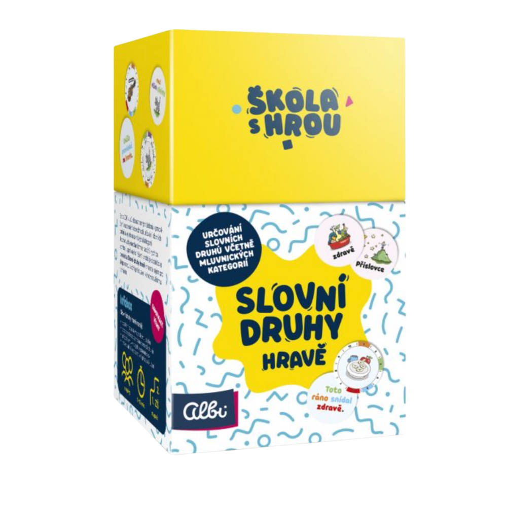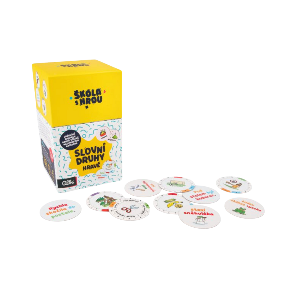 Škola s hrou - Slovní druhy hravě obsahuje: 200 kulatých žetonů se slovy, větami a slovními spojeními, příručku s metodickými tipy.