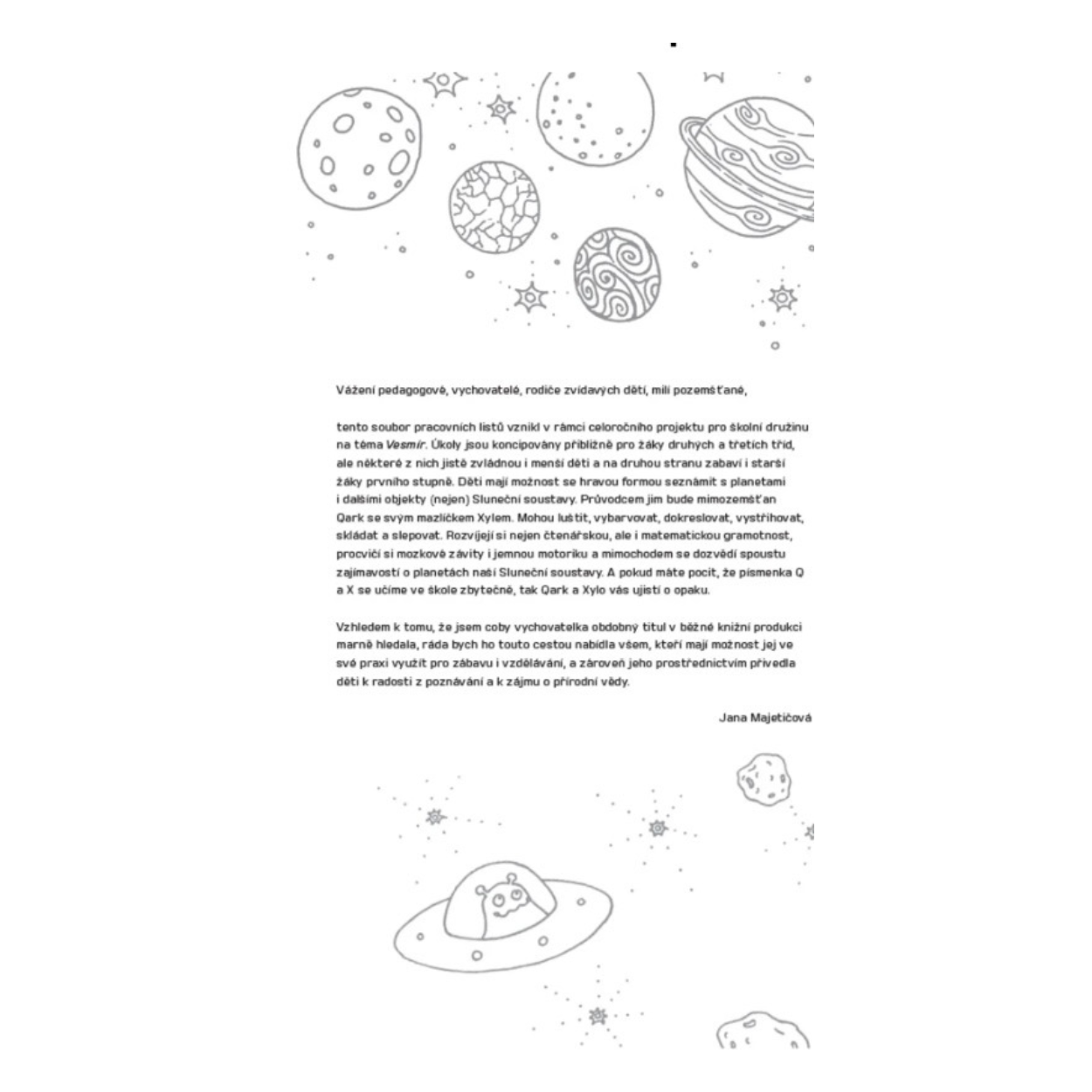 Jana Majetičová je pedagožka na prvním stupni. Vesmírné luštění vzniklo původně jako pracovní listy pro děti v odpolední družině a je tedy testováno přímo na dětech.