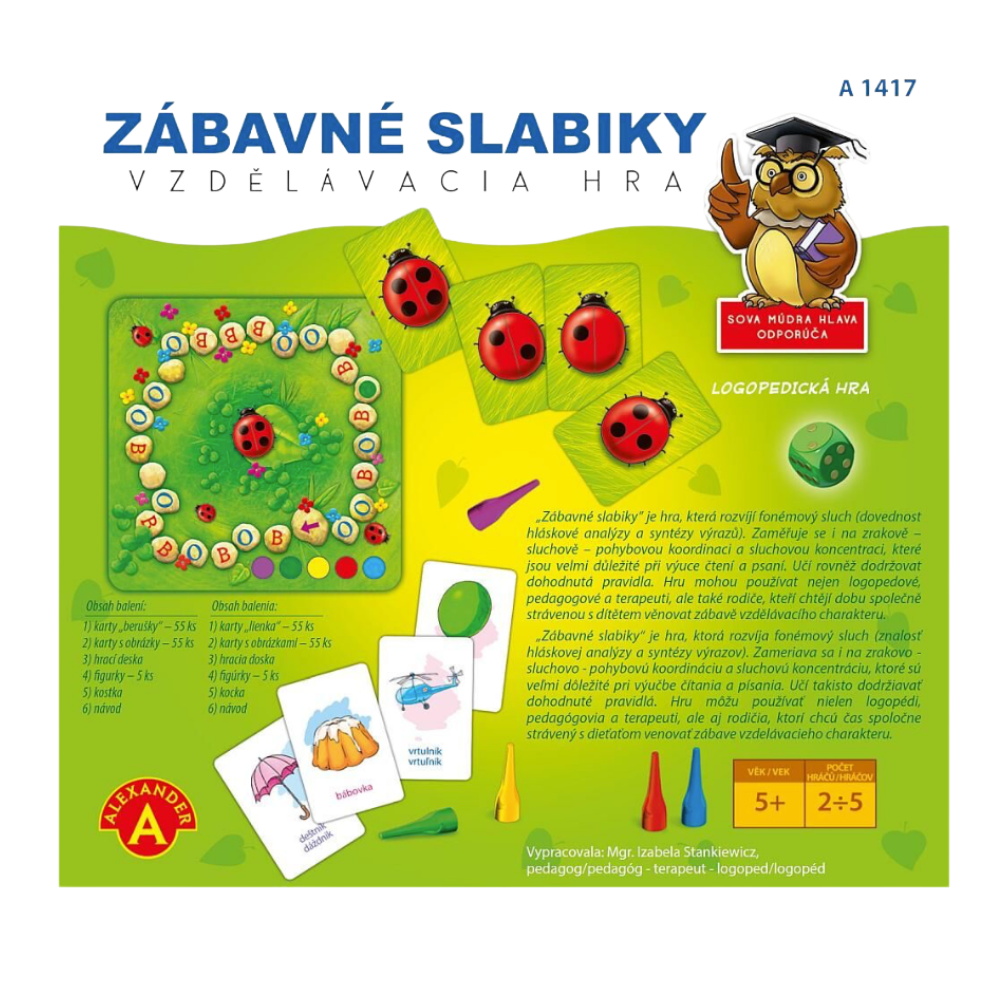 Zábavné slabiky" je na učná hra pro děti od 5let, která rozvíjí fonémový sluch (dovednost hláskové analýzy a syntézy výrazů). Zaměřuje se i na zrakově – sluchově – pohybovou koordinaci a sluchovou koncentraci, které jsou velmi důležité při výuce čtení a psaní. Učí rovněž dodržovat dohodnutá pravidla.